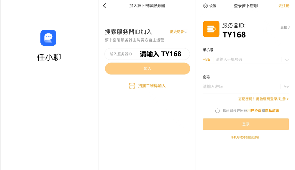下载任小聊APP,输入服务器运营方提供的服务器ID TY168;搜索到对应的服务器后,输入手机号码,发送短信验证码,填入正确的短信验证码、姓名,并设置密码,完成注册。